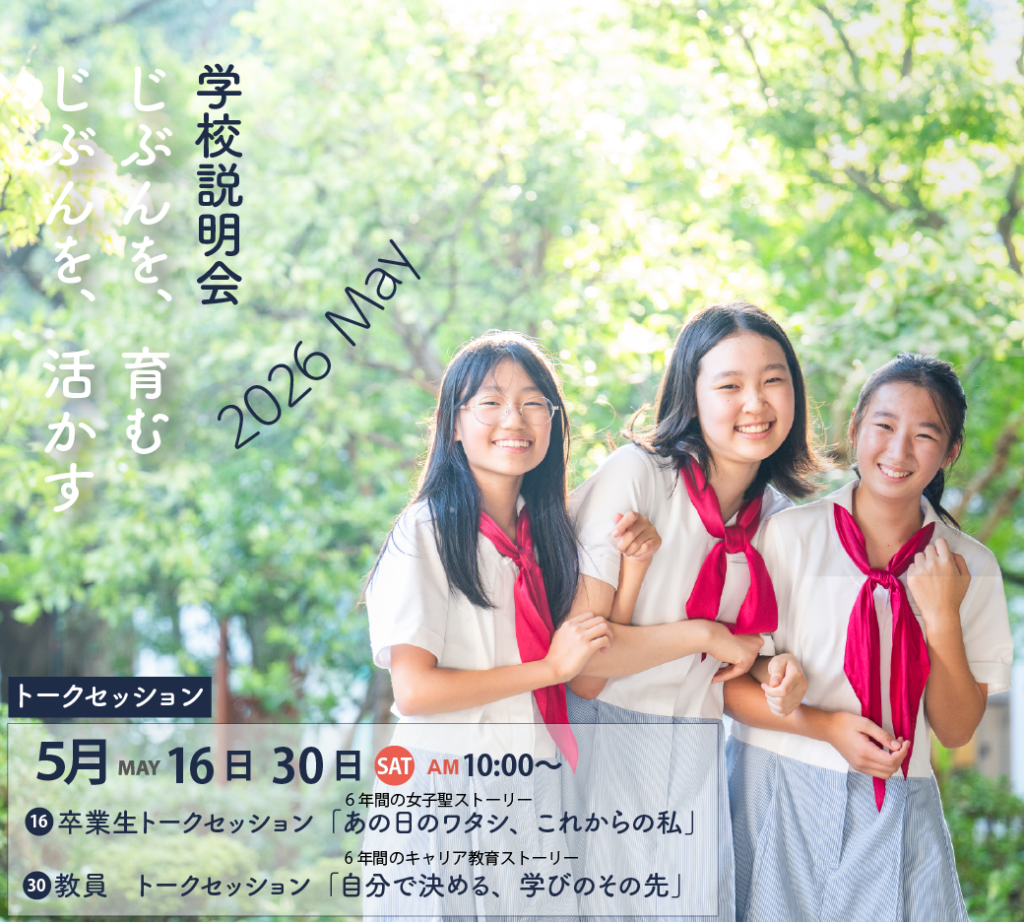 申し込みはこちらより 4月18日(土)12:00より申し込み開始します 5月開催!学校説明会 5月の説明会は「トークセッション」シリーズです。卒業生や、教員が、女子聖学院で培われる...