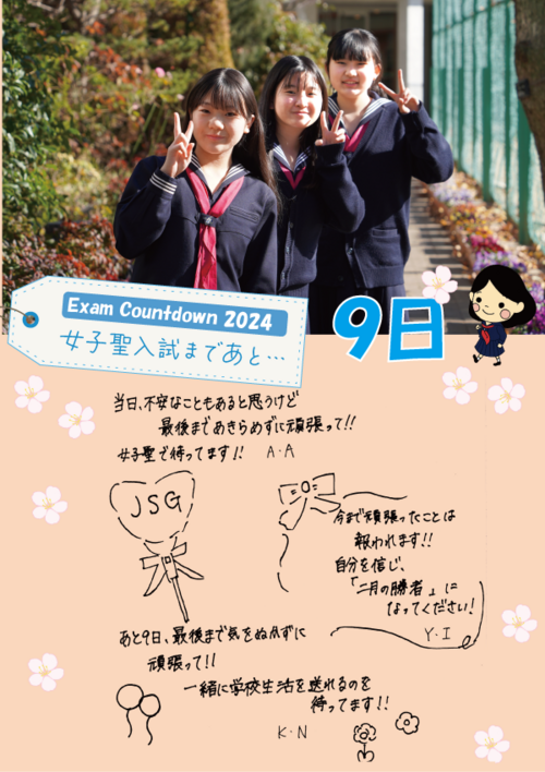受験生の皆様へ!入試応援カウントダウン1/23㈫ 女子聖学院2024入試まで、あと9日となりました...