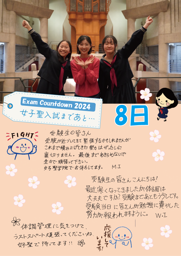 受験生の皆様へ!入試応援カウントダウン1/24(水) 女子聖学院2024入試まであと8日となりまし...