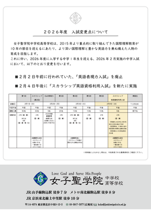 2026年度 中学入試の変更点について 女子聖学院中学校高等学校では、2015年より重点的に取り組...