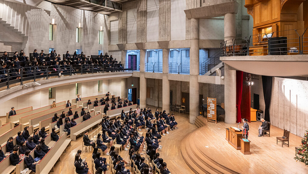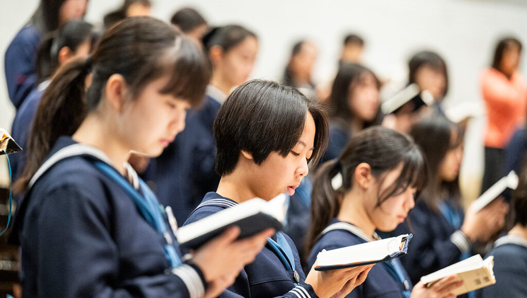 礼拝は本校の教育の要。パイプオルガンの調べに合わせて賛美歌を歌い、聖書の言葉に耳を傾け、心の安らぎ、生きる力と指針を与えられる時です。キリスト教に馴染みがなくてもご心配は要りません。