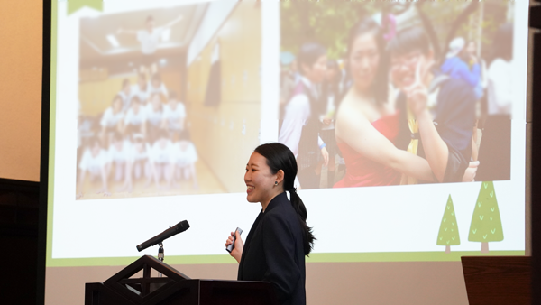 今回登壇してくれたのは、現在書籍編集のお仕事に就かれ2年目を迎えている70回卒業生です。彼女はJSGをキーワードとして、「JOY」(喜び)、「SEED and SOIL」(種と土)、そして「Grit」(やり遂げる力)の3つに分けて、ご自身の体験を語ってくれました。女子聖での学びや友人たちとの出会いから得た喜び、学業のみならず、自己成長やチームワークの重要性を教えてくれる学校での種まき、そして、彼女が女子聖やその後の大学生活で培った根気強さと将来の可能性について、在学中に見せてくれていた笑顔のまま、熱く語ってくださいました。