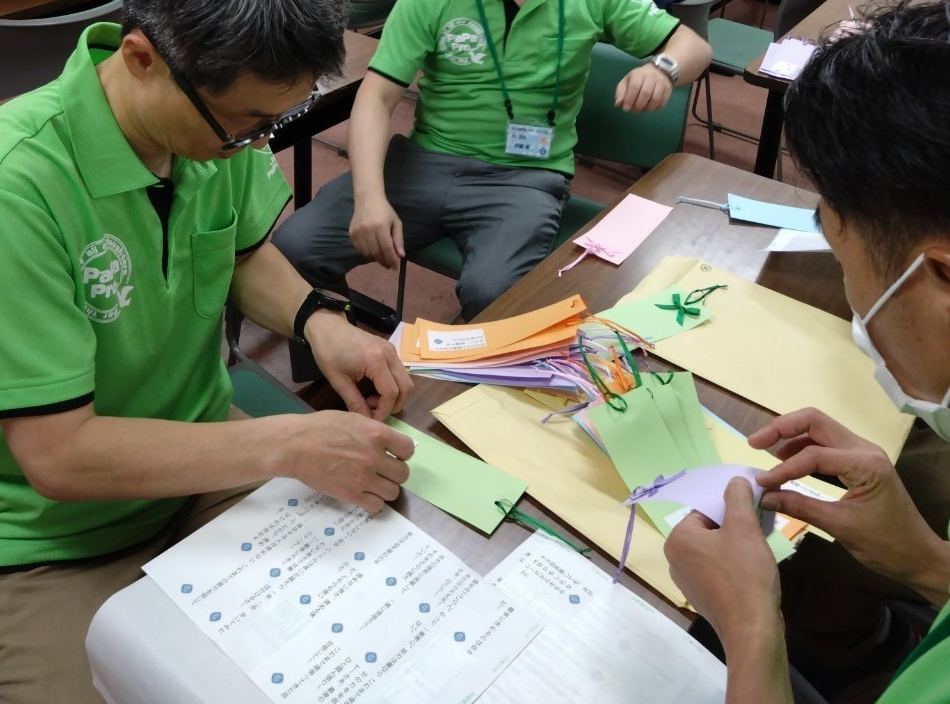 6月10日、今年も七夕企画の準備として短冊作りと笹の設置を行いました。毎年、パパプロOBから短冊が提供され、パパプロメンバーは色とりどりのその短冊の裏に「パパプロメンバーから娘たちへの応援メッセージ」シールを一枚ずつ丁寧に貼り付け作業を行います。笹はチャペル3階の図書館前に中3のクラスごとに4本設置し、準備が整いました。生徒たちが笹の横を通り過ぎる際には、季節を感じる盛り上がりの声や、先生からも感謝のお言葉をいただき、今年の準備もパパプロメンバーにとって嬉しく楽しい時間となりました。