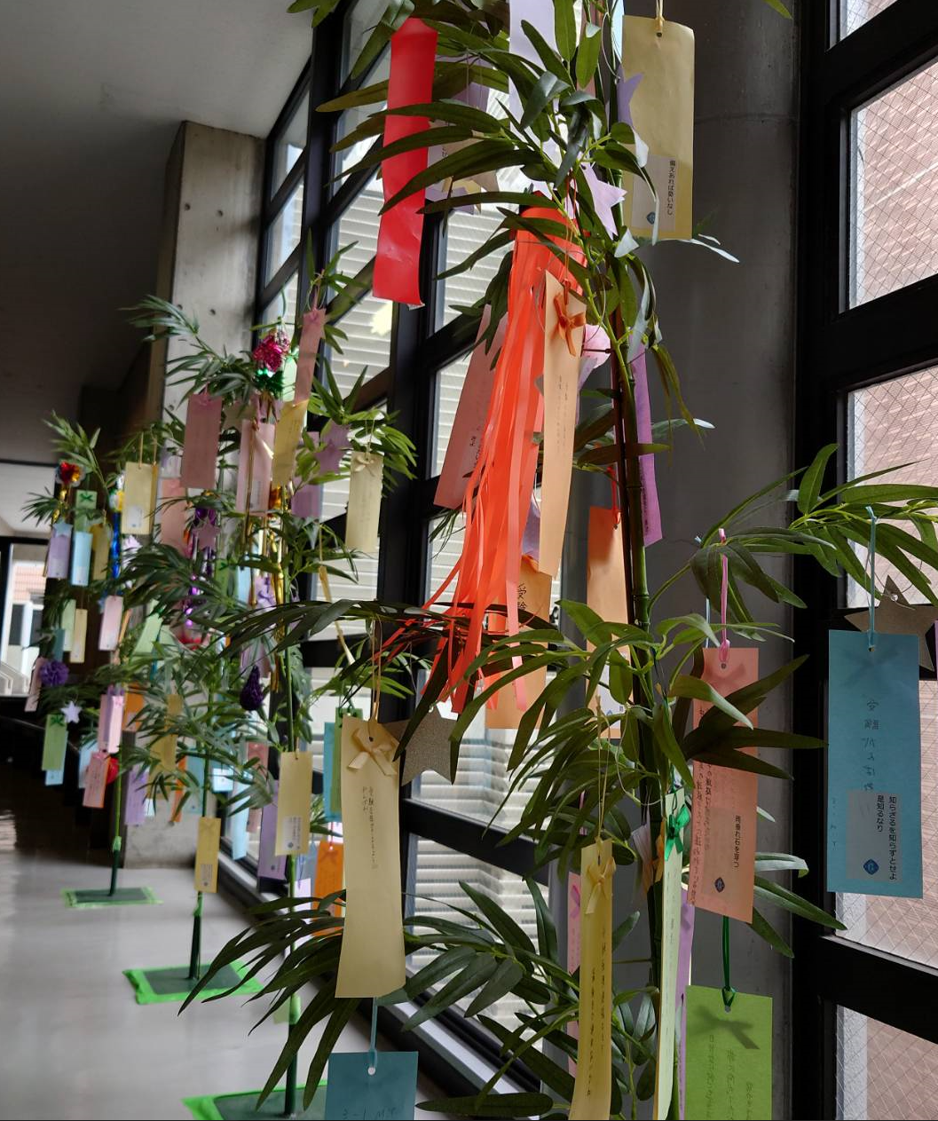 その後、生徒一人ひとりが将来の進路に向けたエールを書いた短冊を笹に飾りつけ、企画は完了です。7月17日の夏の女子聖一日体験日にて受験生向けの展示も無事に終え、短冊はタイムカプセルのように大切に保管されます。
