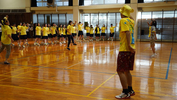 変装した先生たちと共にまずは『ジャンボリミッキー!』を踊り、身体を温めます。
