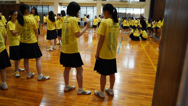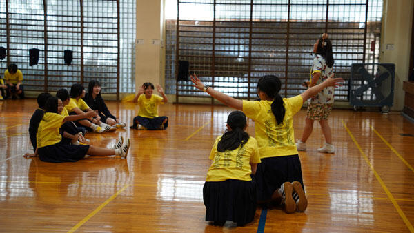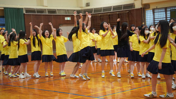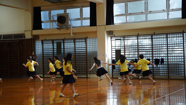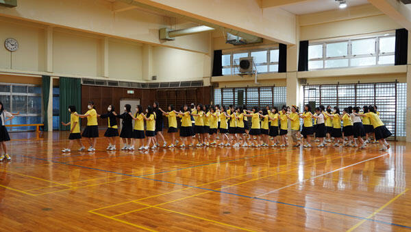 そのあと、クラス毎で相談し、各クラスから3人の鬼を選出し、『手つなぎ鬼』が始まりました。ルールとしては、1クラスずつ行い、他のクラスは舞台で応援し、鬼は他のクラスの生徒をつかまえます。手つなぎ鬼は、自分のことだけを考えるとなかなか進めません。4人以上になるともうヘトヘト!他クラスの「がんばれー」の手拍子と共に、鬼は捕まえた人と手をつなぎ協力し、逃げる側は全力で走ります。先生の「終了」という声に、倒れこむ鬼たち。拍手が沸き起こっていました。