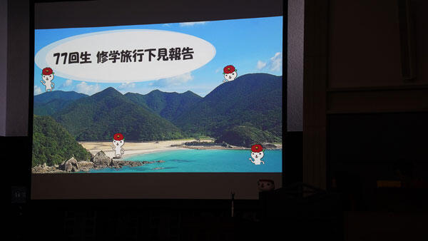 修学旅行に行くにあたり、修学旅行委員が中心となり、これから学年一人ひとりの力を合わせて作り上げていきます。まずは、修学旅行委員がこの旅行を77回生最高の思い出にするために作成したムービーを上映し、鑑賞しました。
