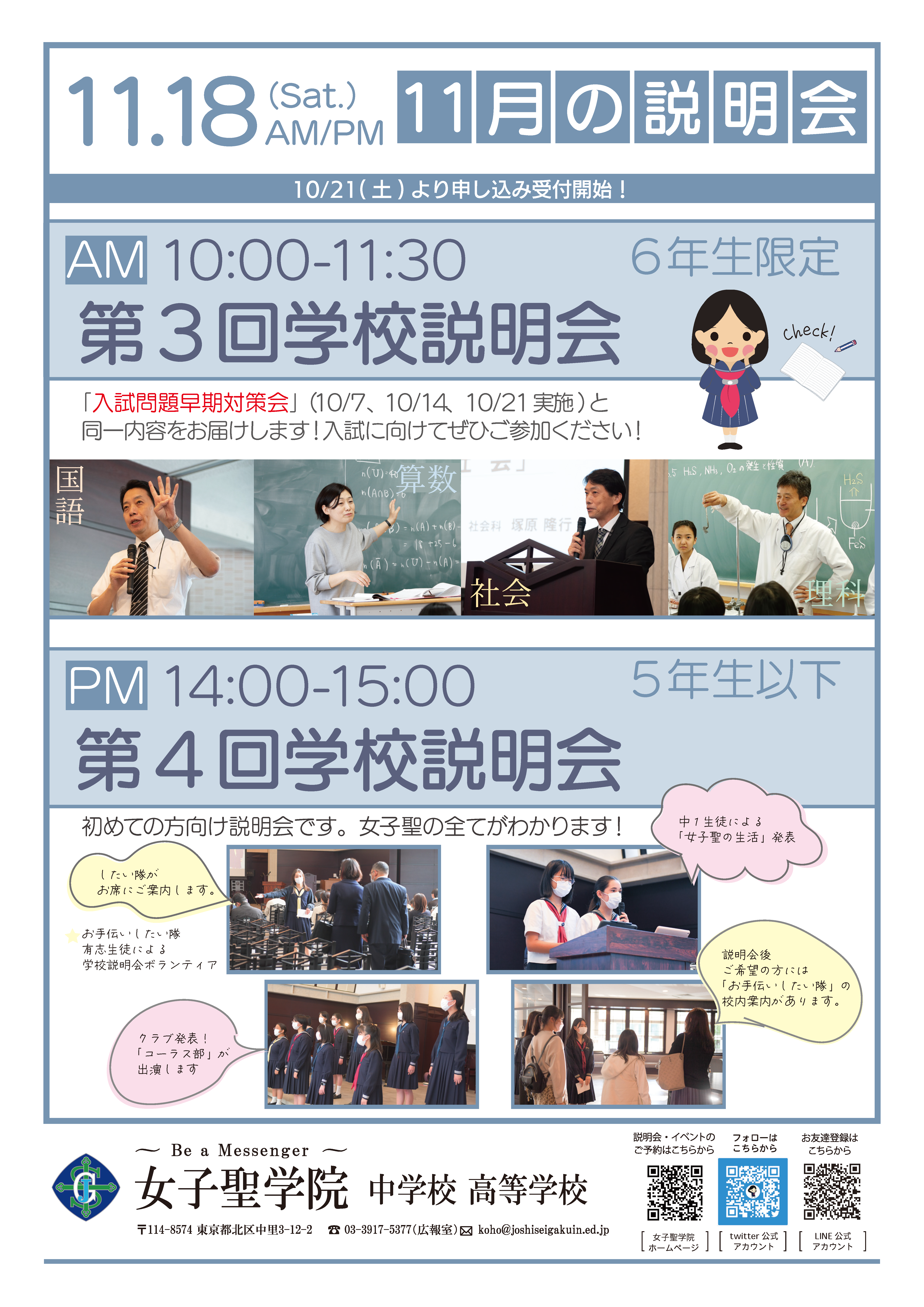PM「第4回学校説明会」は、5年生以下の方をお迎えし、女子聖学院の学校教育・最近の取り組み・生徒の様子など盛り沢山でお伝えします!女子聖の魅力がわかる説明会となっておりますので、ぜひまだ説明会にご参加いただいていない方はお申込みください。お待ちしております。