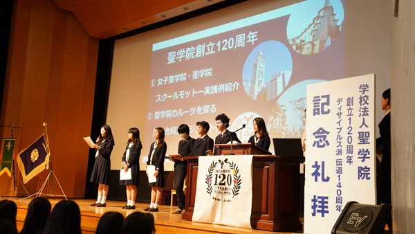礼拝後には、120周年を記念して立ち上げられた聖学院・女子聖学院歴史探訪プロジェクトチームの発表がありました。文献調査や、創立の地を巡るフィールドワーク、元女子聖学院校長・元聖学院院長の小倉義明先生の講演を通して、生徒たち自身が発見した聖学院の源流について報告してくれました。聖学院全体の節目である今こそ、これからの聖学院を作る生徒一人ひとりが120年の歴史を受け止め、次世代に受け継いでいくことの必要性を力強く語ってくれました。