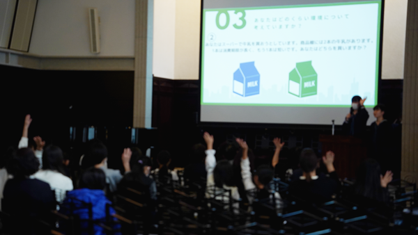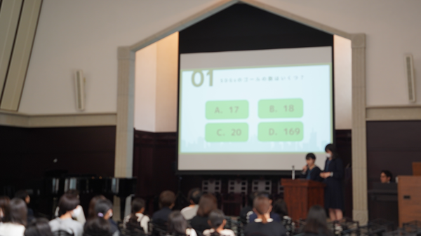 SDGsプロジェクトは、聖学院中学校高等学校と行っている男女合同のプロジェクトで、「電力削減」「フードロス」など6つのチームに分かれて、課題解決に向けて学びを深めています。途中、クイズを出しながら、小学生や保護者の方にSDGsを身近に感じていただきました。