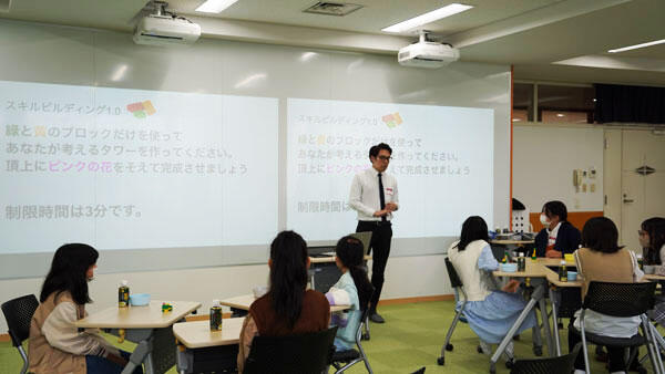 親子でご来校いただき、お嬢様はワークショップの会場へ、保護者の方は同時開催の「表現力入試説明会」の会場へと分かれました。ワークショップは英語表現力入試に向けネイティブの教員と一緒に対策をするクラスと、BaM表現力入試に向けレゴ®ブロックを活用し思いを言語化するクラスに分かれ、体験をしていただきました。