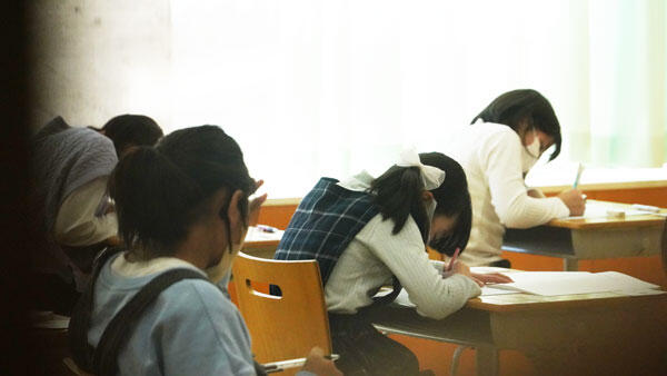 本校の正面玄関より入っていただき、保護者の皆さまはチャペルへ、受験生の皆さまは、受験番号に分かれて、教室へ向かいました。受験生の皆さまには、入試当日に近い形で試験会場にて模試問題に挑戦していただきました。
