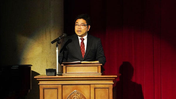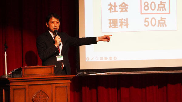 つぎに中Ⅰ在校のお父様に登壇していただき、女子聖へ志望した理由、家庭での取り組み方、入学後のお嬢様の様子についてお話しいただきました。「志望する学校に訪れる日はチャンスの日。自分が入学した姿をイメージしやすくなるので、前向きな言葉をかけてあげましょう」と応援の言葉を保護者の皆さまにかけて下さいました。