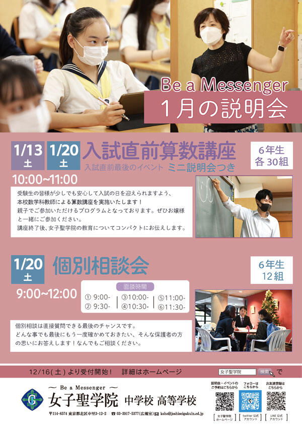 1月13日(土)は、講座終了後に「ミニ説明会」も行います。女子聖学院の教育についてコンパクトにお伝えいたします。