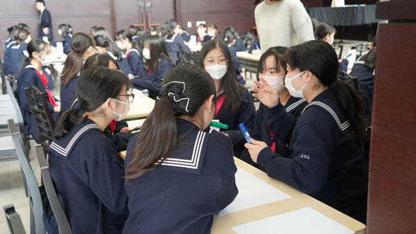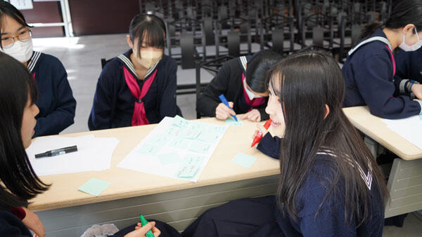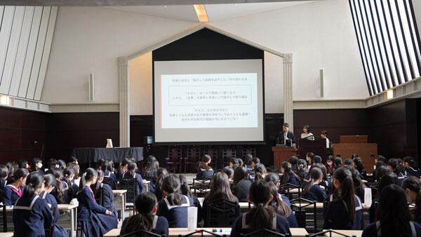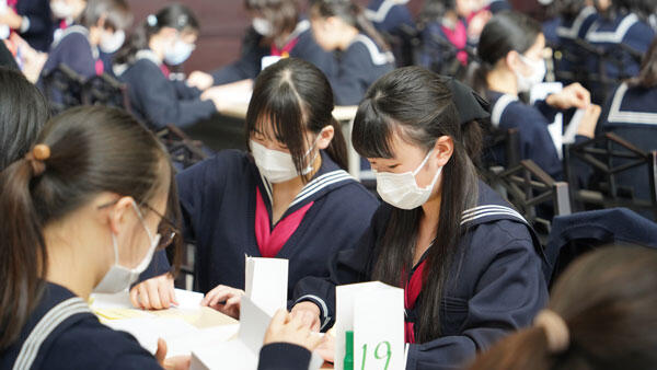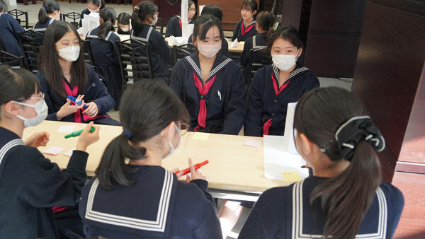 女子聖学院では、中学生は、総合学習の時間を週2回程度設け、探求学習を行っています。探求学習は本校のモットーである「神に仰ぎ人に仕う」を土台に行っています。