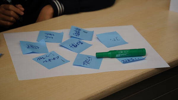 次に「自己紹介ゲーム」を行いました。このゲームのポイントとして「話しやすい環境の作り方」を教わり、実践しました。その後、「共通点探し」を行い、一番多いグループで40個以上共通点を発見することができ、これには館野先生も驚いていらっしゃいました。そして、「共通点探しゲーム」をした際に「相手の良かった行動」を見つけ、相手に直接伝えるフィードバックを行いました。