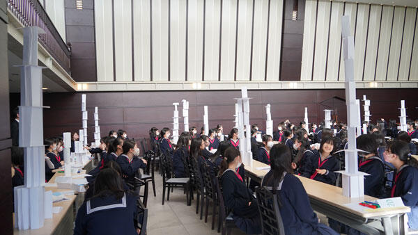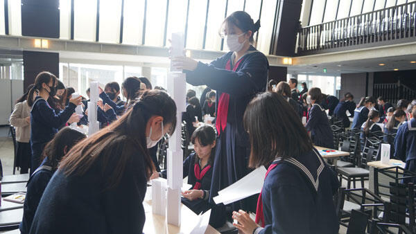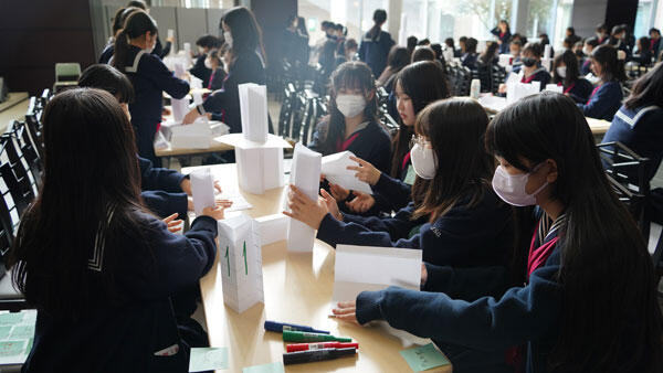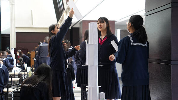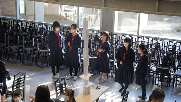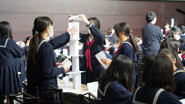 そして、今回の対決で、「テーブルを2つつなげていいか」や「ピアノの上から組み立てたい」等の意見が出た。こういう発想の転換は今後も大切にしてほしい。みんな一人ひとりが何かしらの役割を担い、成し遂げられた。リーダーシップとは、常に中心にたつ人が発揮するものではなく、一人ひとりが環境を作ることで良いチームになり、良いリーダーシップができる。今後、体育祭などで今日の経験を活かしていってほしいと締めくくりました。