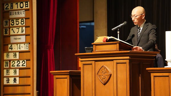 いつもより照明を落とした中、東日本大震災を体験した小学3年生の作文が、宗教委員長によって読まれました。