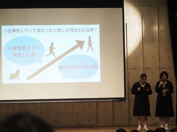 『日本における長時間労働による影響は何?』という「問い」を掲げたチームは、学校を長時間労働の現場として捉えて、女子聖学院中高の5人の先生に実際にインタビューをした結果を分析して発表を行いました。