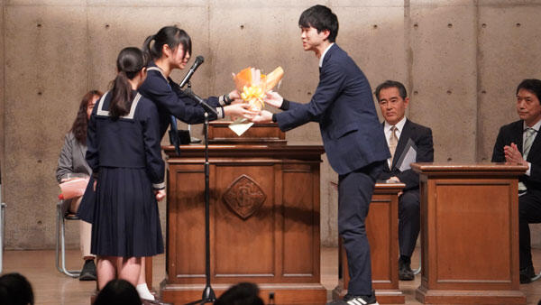 感謝会では、退職なさる先生方から最後のメッセージをいただき、生徒から手紙と花束を贈られました。