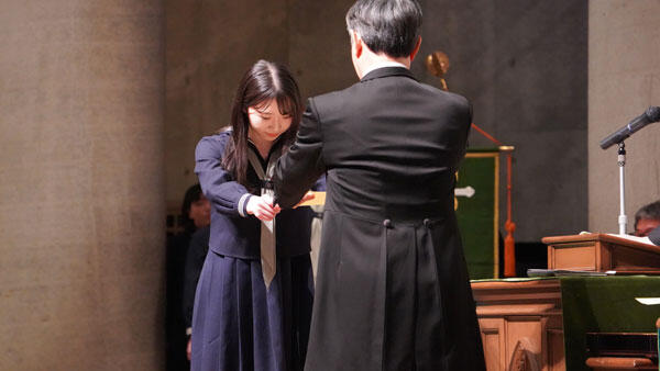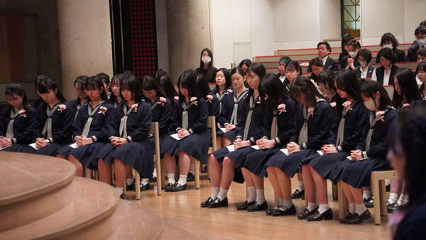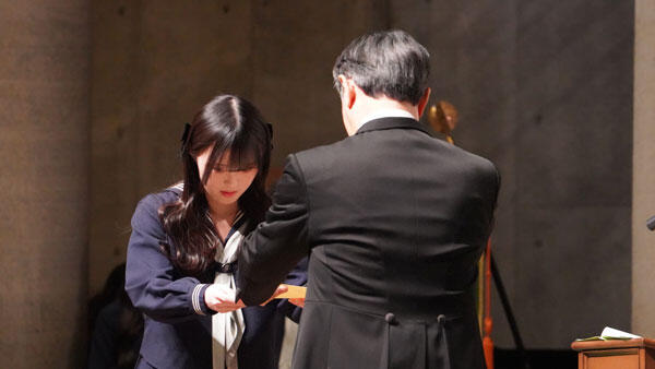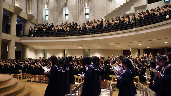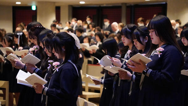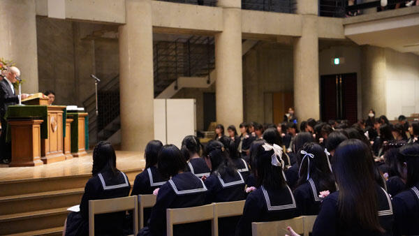 礼拝形式で行われる女子聖学院の卒業式は、パイプオルガンの音色が響く中、卒業生が入場し、聖歌隊の賛美奉献から式典が始まります。
