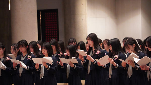 最後に全員で女子聖学院の歌を歌い、吹奏楽部の演奏「威風堂々」と会場の拍手で、卒業生が見送られました。