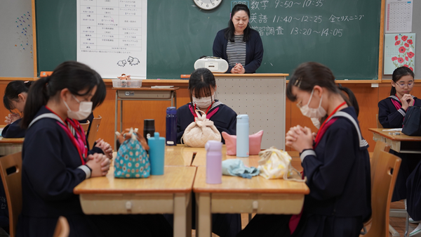 お食事をいただく前の感謝のお祈りを先生と一緒にします