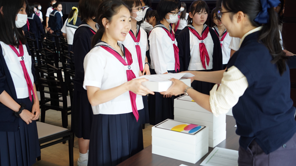 5月8日(水)「総合」の時間に、中学1「iPad授与式」が行われ、一人ひとりに「iPad」が配られました。いよいよデジタル機器を取り入れた授業・学校生活のスタートです。