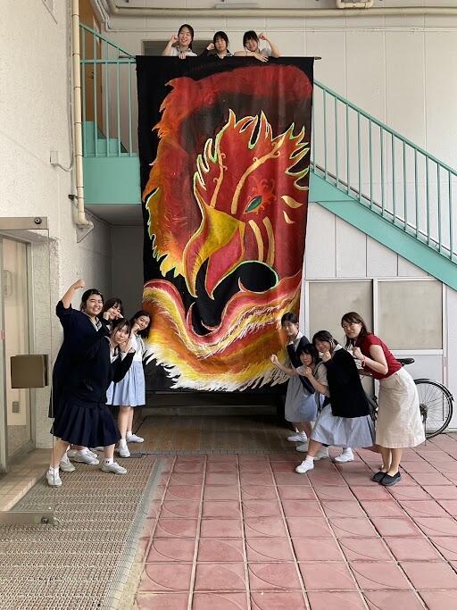 また、美術係によって紅組の垂れ幕を1から作り直し、ついに完成しました!この垂れ幕のもと、一致団結して優勝をつかみ取りましょう!