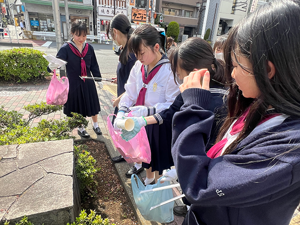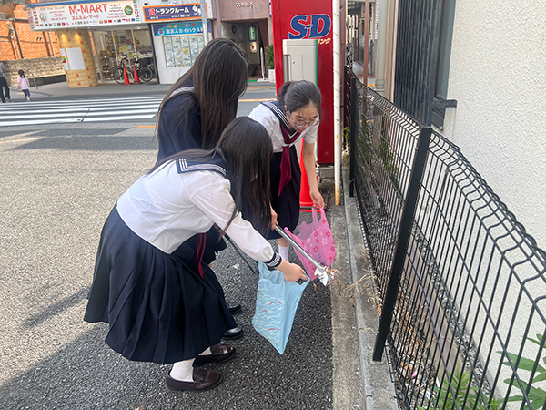 3〜4人で1チームをつくり、学校から駒込駅の区域に落ちているゴミを拾ってきました。毎日通学している道でも、気にして歩かなければ、道端に落ちている小さなゴミには気がつかないものです。生徒たちは低木の根本に落ちているお菓子のゴミや空缶、側溝にポイ捨てされたタバコの吸い殻などを見つけていました。拾っている間、近所の方から感謝の言葉をかけていただいた生徒もおり、感謝される喜びを感じていました。