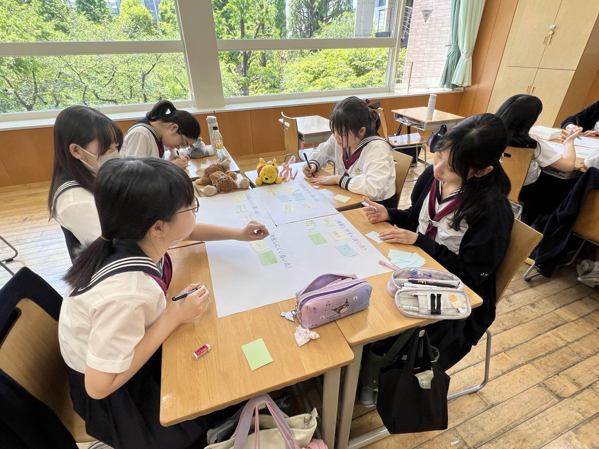 4月から新しいクラスになって一ヶ月が経ち、クラスの良いところと改善したほうがよいところを考えます。まず、班になってそれぞれが考える良い点・改善点を挙げました。生徒たちは自分たちが考えるクラスの姿を、①発展しやすい良い点、②発展しにくい良い点、③改善しやすい悪い点、④改善しにくい悪い点の4つのグループに分けていきました。「元気よく挨拶ができるとことが良いところ」、「ロッカーの整頓が十分にできていないところが悪いところ」など、多くの意見が飛び交いました。それぞれが思うクラスの姿を発言するときには必ず理由を言うこと、また聞いている人は否定しなことをルールに意見共有は進められていきます。そして、HR委員の司会で、それぞれの班から出た考えを全体に共有し、その後は発展・改善しやすい良い・悪い点について、改善策となるクラスでの仕組み作りを考えました。