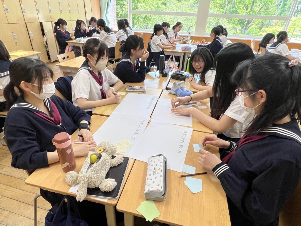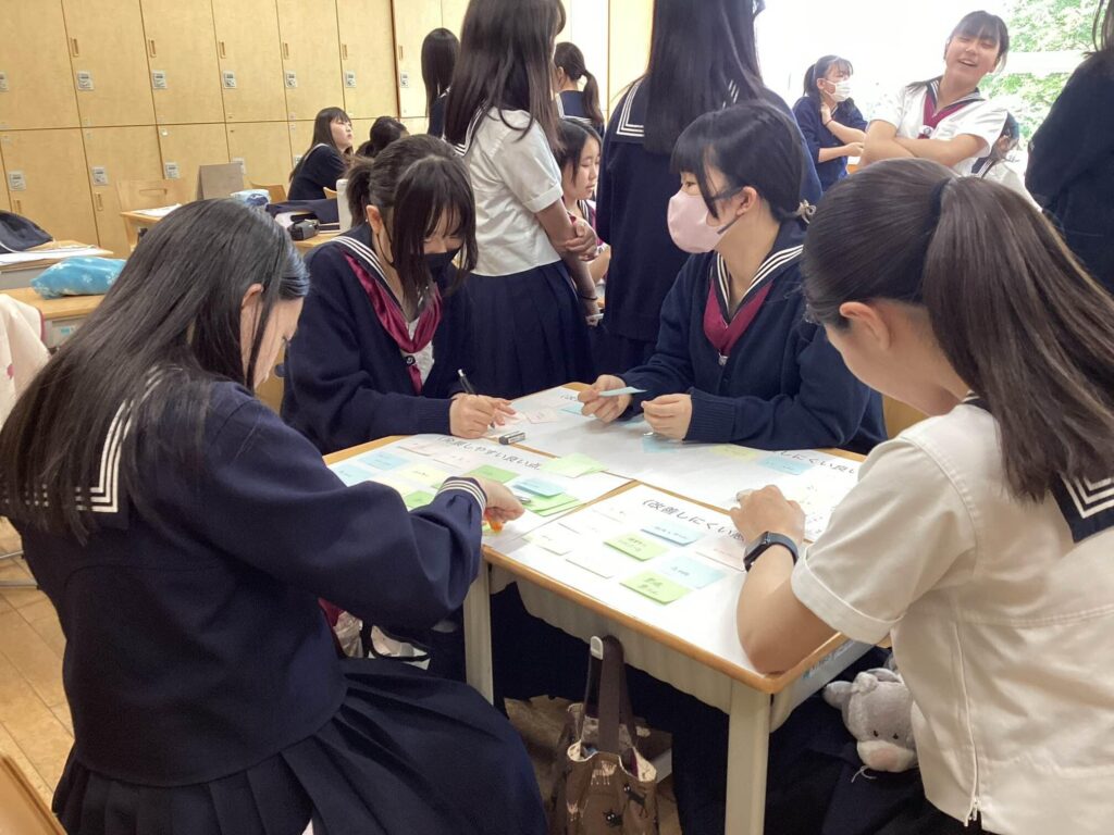 総合学習や聞く話す(国語科)の時間にも、対話力を身につけることを目標に活動が進められています。そこで、LHRでも生徒たちの話し合いの機会を増やすために、また普段の学校生活のあり方を自分ごとし考えながら過ごすことができるように、クラス目標を考える時間を持ちました。