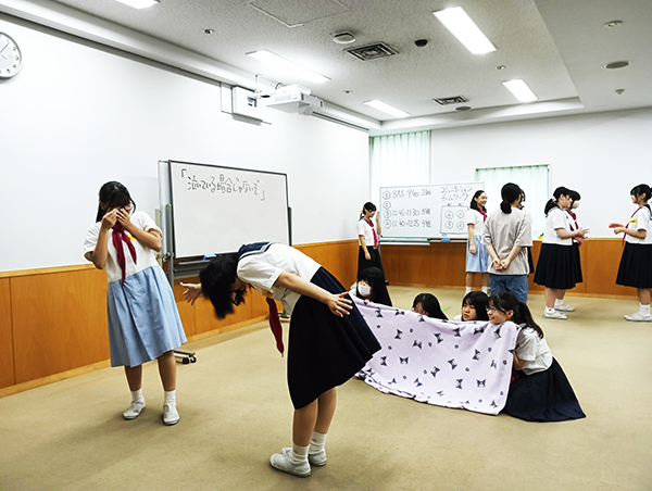 中学1年生の国語の授業を使い、役者さんや演出家さんのスタッフのみなさんをお呼びし、楽しいレクやジェスチャーゲームを通して、コミュニケーションにおいて大切なことを学びました。