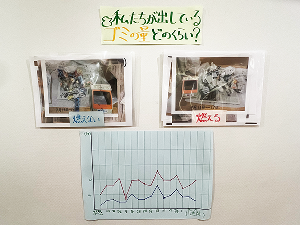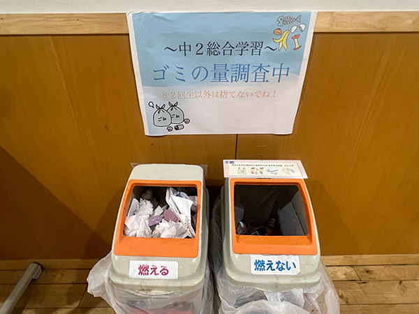 中学2年生では総合学習の時間に「自然環境」について学習しています。キャンプ中にも、ペットボトルは持参せずにマイボトルで過ごすことをルールに決め、ゴミを減らすことを心がけました。また、4月から毎週、学年のゴミを分別し、その量をはかり、自分たちが日々どの程度のゴミを排出しているのかを可視化する運動も行っています。