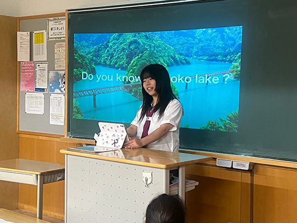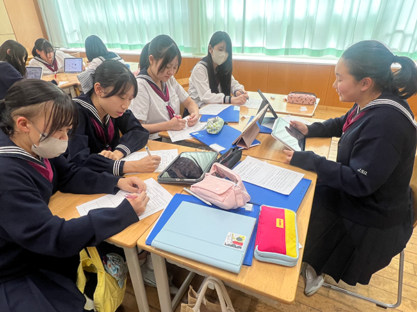 英語科では、総合学習での学びを英語で発表できるように作文ワークシートを作成しています。生徒達はサンプルの文章を参考に作文します。その段階で習う英文法を意識的に取り入れさせ、授業内で扱われた新しい文法を自分たちの言葉に落とし込んで活用することで、文法の理解だけでなく、自らの言葉で活用できるように定着していきます。実際に行われた発表でも、クラス全員の前でそれぞれが一生懸命に覚えた内容を、堂々と発表している様子が見られました。総合学習の授業内で他のチームが何を調査しているのか知っているため、お互いの発表の内容も分かり、友達の発表を聴きながら新しい単語を自分のものにすることもできていました。
