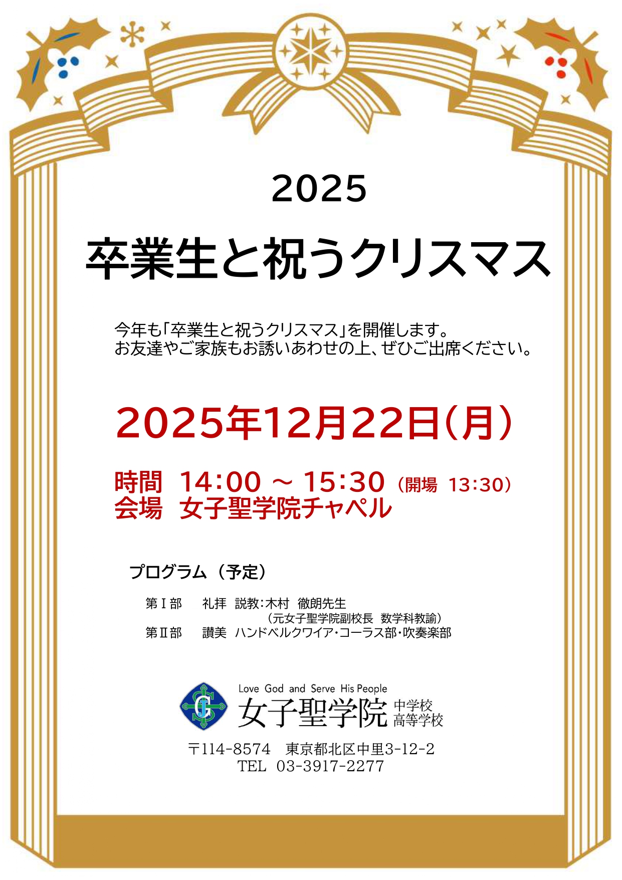 卒業生各位主の御名を讃美いたします。いつも母校のために祈り、温かいお支えをいただいておりますことを感謝いたします。今年も「卒業生と祝うクリスマス」を開催いたします。卒業生の皆様のご出席を、お待ち申し上げております。<日時>2025年12月22日(月)14:00~15:30<会場>女子聖学院チャペル<プログラム予定>説教:木村徹朗先生(元女子聖学院数学科教諭) 讃美奉仕:ハンドバルクワイア、コーラス部、吹奏楽部2025年11月14日 校長 安藤 守