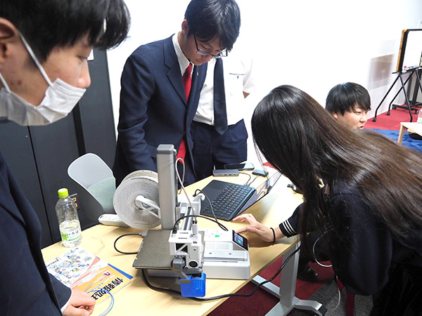 また、ピアスなどのアクセサリーも3Dプリンターで作られていることを知ると、その細やかな形の美しさに思わず感嘆の声が漏れ、「私たちも作って記念祭で販売してみる?」という声も聞こえてきました。身近なものがどのように作られているのかに気づいたことで、「つくる」ことそのものへの関心が高まったようです。
