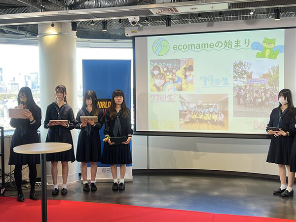 13時より始まった授賞式には日本全国のあらゆる企業や団体の参加がありました。ecomameの生徒たちは慣れない大人の雰囲気に緊張しておりましたが、多くの方々よりお声をかけていただき、時間が経つにつれて普段の様子を取り戻しておりました。今回の授賞式には、各賞授与の他に、代表企業さまとecomameからの活動報告の機会が設けられておりました。ecomameからは高校1年生の生徒12名が、ecomameの発足からこれまでの活動実績報告をさせていただきました。先輩たちが作り上げてきた活動も含めて、自分たちの言葉を介して活動を伝えることで、まだecomameの経験が浅い生徒たちも継続の大切さと深さを実感していきます。