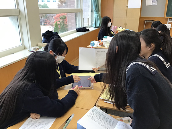 女子聖学院では、中学3年時より「古文」の授業がスタートしていきます。音読や古典文法の確認といった基本的な学習だけでなく、自分たちで考えたり活動したりしながら、古文を楽しむことを目指しています。