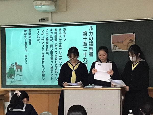 まず、グループに分かれてくじを引き、担当するお話を決めましたが、毎朝の礼拝で聖書を開いている生徒たちも、文語で書かれた文章を見た途端「わからない……」と戸惑い気味。けれども、グループで協力して調べていくうちに「ああ、この話か!」「聖書の授業で読んだことがある」という声もあがってきます。古文の学習を始めたばかりの生徒たちにとっては大変な作業だったかもしれませんが、お話の場面のイラストを描いたり、パワーポイントを作成したり、班ごとに工夫して発表することができました。
