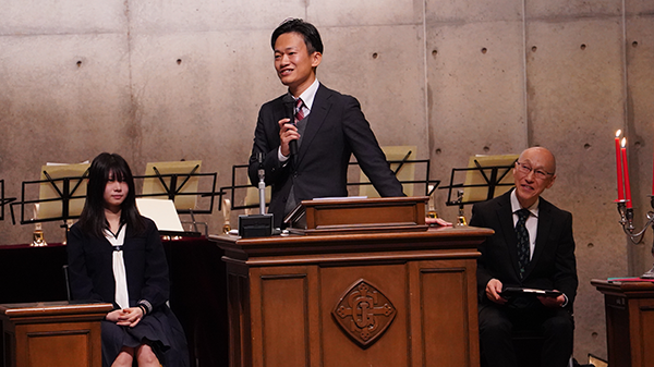 クリスマスメッセージは、「輝く星があなたにも」と題し、蕨福音自由教会の幹祐希先生にご奉仕いただきました。先生ご自身の体験をもとに、暗さの中にあっても心に差し込む希望の光について語ってくださり、生徒一人ひとりが自分自身の歩みを静かに見つめ直す時間となりました。