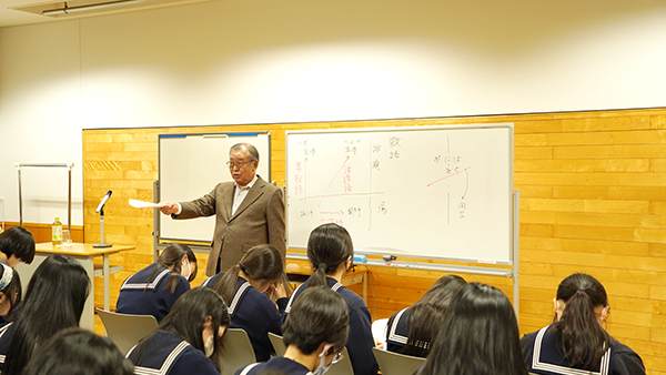 中学3年生には、助動詞がなぜ複数の意味を持つのかという点から、文法が読解に直結していることを実感できる内容でした。また、高校1年生には、敬語を手がかりに省略された主語が浮かび上がってくる古文読解の面白さが示されました。