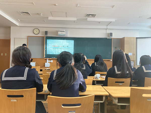 学校の体育館シューズでもお世話になっております、ADSS東京株式会社 藤井俊輔さんより、2月9日に環境セミナーを実施していただきました!藤井さんとの出会いは、2年前の4月に訪れたEarth Day Tokyoのサステナブルな制服の提案ブースでecomameメンバーが話を聞かせていただいたことがきっかけでした。そこでの出会いから、11月に本校で開催される記念祭にも毎年足を運んでいただいています。そして、昨年は現高2・高3生徒のメンバーに向けて行なっていただいた「サステナブル ファッション」セミナーを、今回は現高1メンバーに向けて再び実施していただきました。