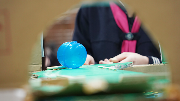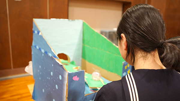 そして、いよいよ環境ブース体験の始まりです。17つ用意された環境ブースは、各チームが1年間学んできた環境問題の中から、自分たちが最も取り上げたいと思った課題をもとに作られています。