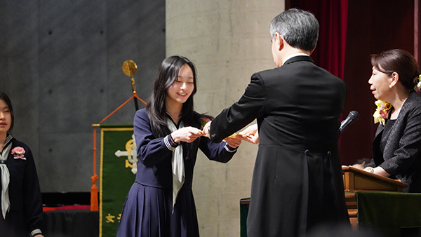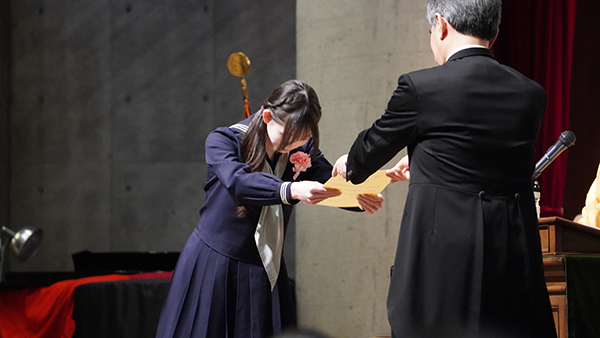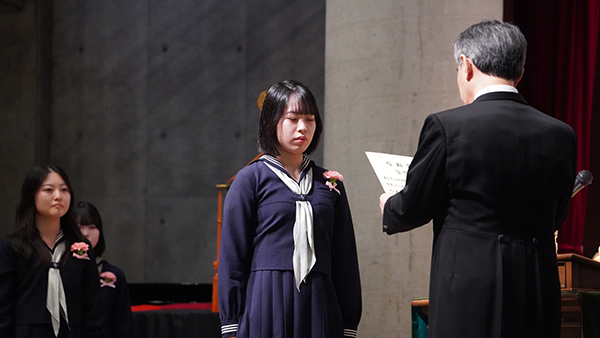 卒業証書授与では、一人ひとりの名前が呼ばれ、それぞれがこれまでの歩みを胸に刻みながら、校長より証書を受け取りました。また、皆勤賞・精勤賞の表彰も行われ、仲間からの温かな拍手が送られました。