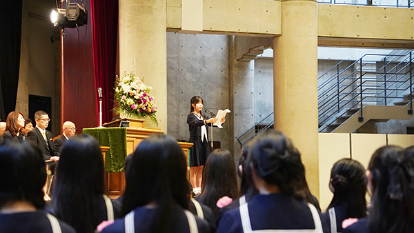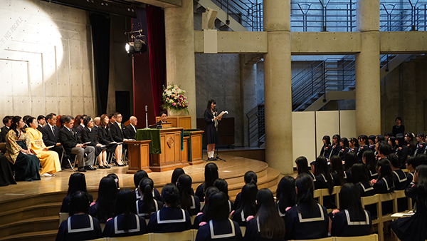 女子聖学院の卒業式は、礼拝形式で行われます。パイプオルガンの音色が響く中、卒業生が静かに入場し、聖歌隊による賛美奉献、聖書朗読、祈りとともに式が進められました。こうした厳かなひとときは、本校ならではの大切な伝統です。