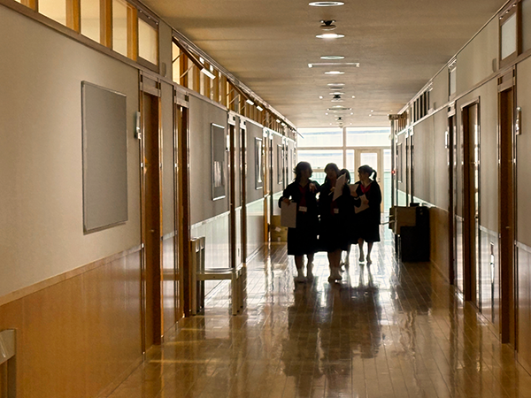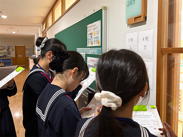 入学して間もない84回生にとって、活動の場はまだ1階のホームルーム教室が中心。今回は中学2年生以上の先輩たちのフロアにもお邪魔することになるため、「小声で相談しながら回りましょう」と声をかけ、チャペルから出発しました。